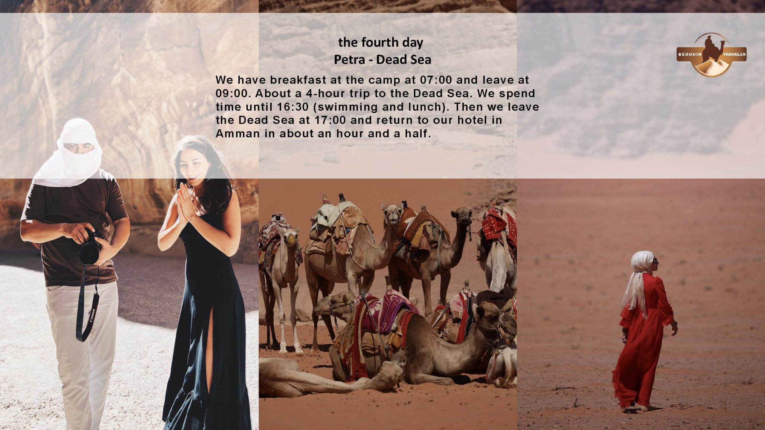 #01/ Bedouin trip DAY 1: AMMAN AIRPORT / HOTEL AMMANDAY 2: AMMAN / WADI RUMDAY 3: WADI RUM FULL DAYDAY 4: WADI RUM / PETRADAY 5: PETRA / DEAD SEA / AMMANDAY 6: A FREE DAY OR TO ADD A SPECIAL ACTIVITY OR VISITDAY 7: AMMAN / AIRPORT